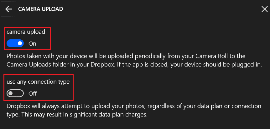 In the Camera Upload settings, click the slider labeled “camera upload” to the “On” position to enable automatic uploads. By default, these uploads only happen over unmetered wifi connections. If you want automatic uploads to happen over a metered connection or over a mobile data connection, you need to enable the “use any connection type” slider.