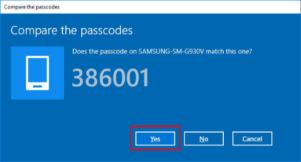 - Windows 10 and your Android will show a passcode. Ensure that the codes match on both devices. Tap OK on the Android and Yes on Windows 10.
